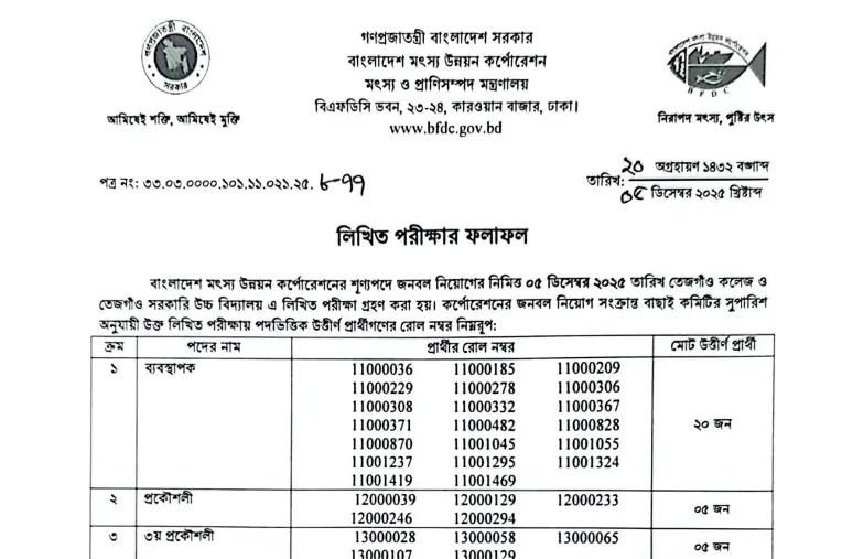 Bangladesh Fisheries Development Corporation (BFDC) published the Exam Result for various post. A total of 47 candidates has passed on Computer Operator and 26 on Cashier post. Candidates can now check their results on the official website.