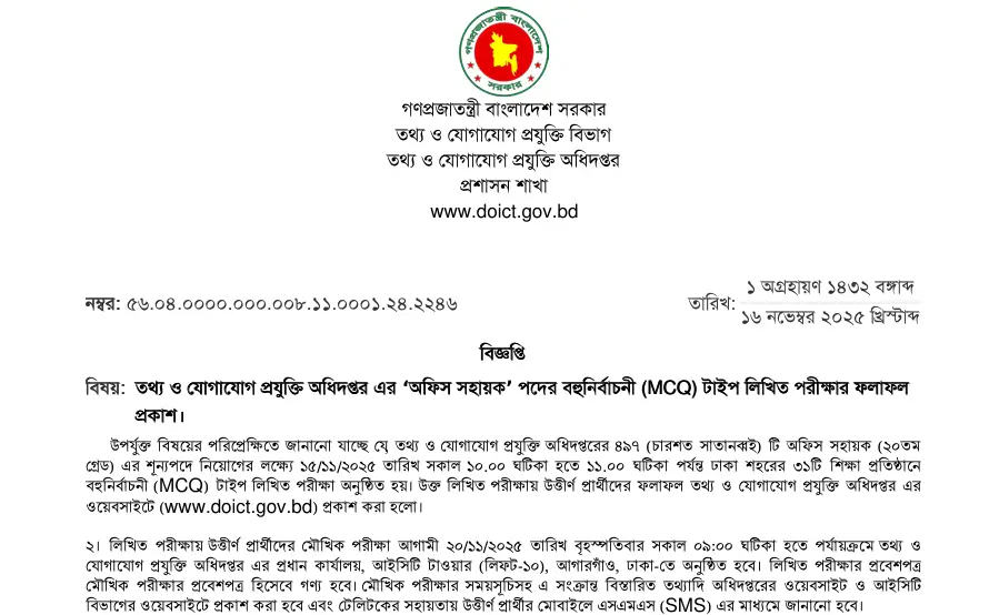 The Department of Information and Communication Technology has published the DO ICT Office Sohayok Exam Result 2025 for the MCQ Type Exam. Those who participated the exam conducted on November 15, 2025, can check their results on the official website. The selected candidates list along with the important date available on the notice.